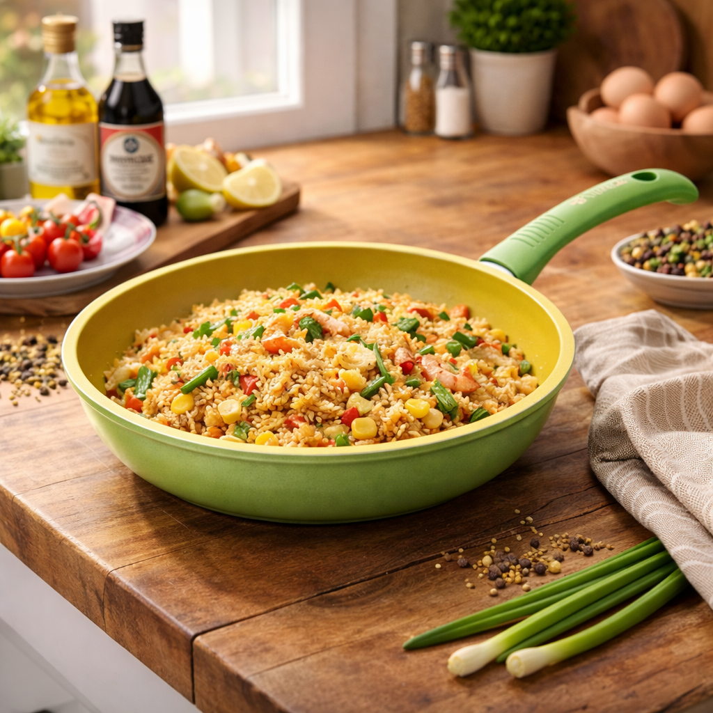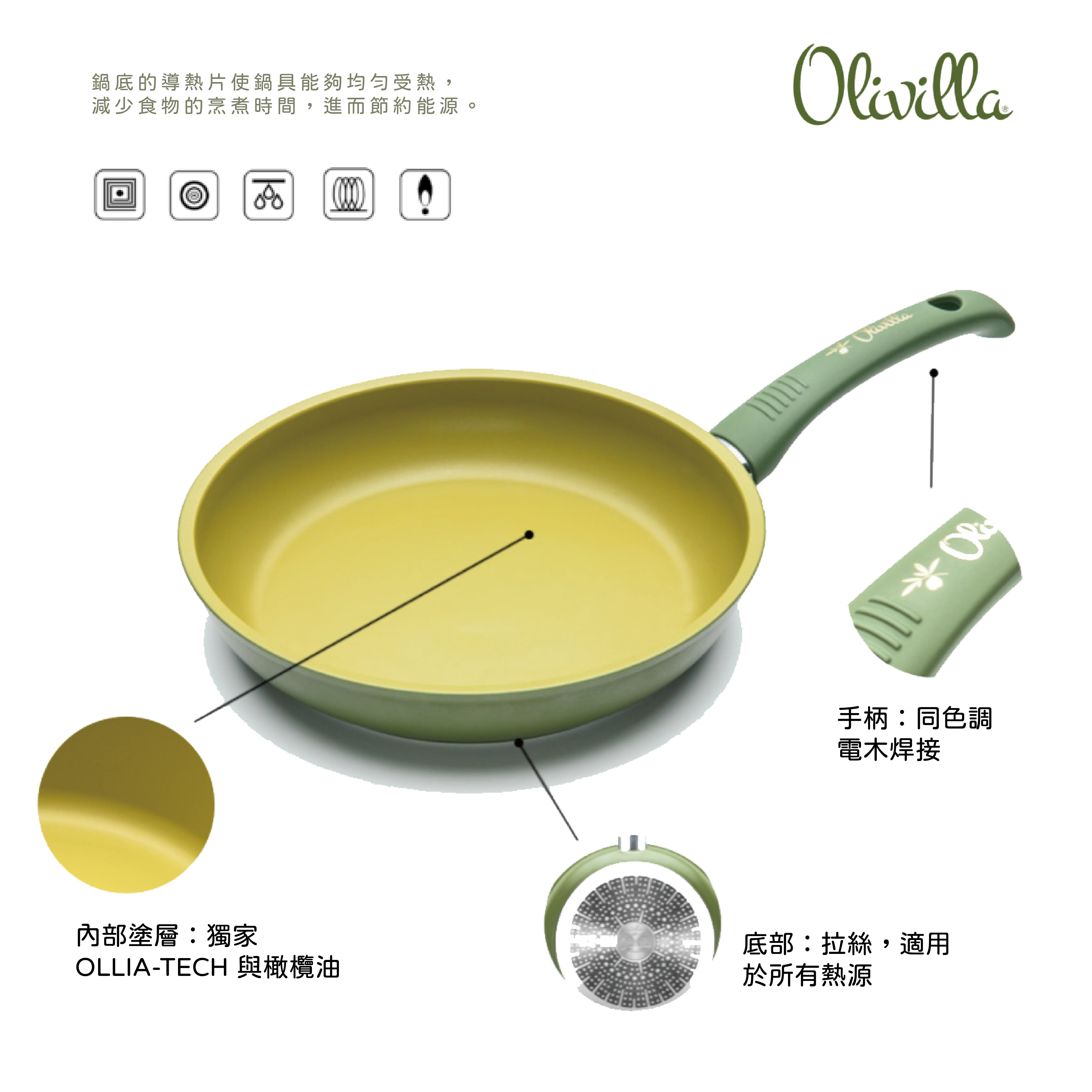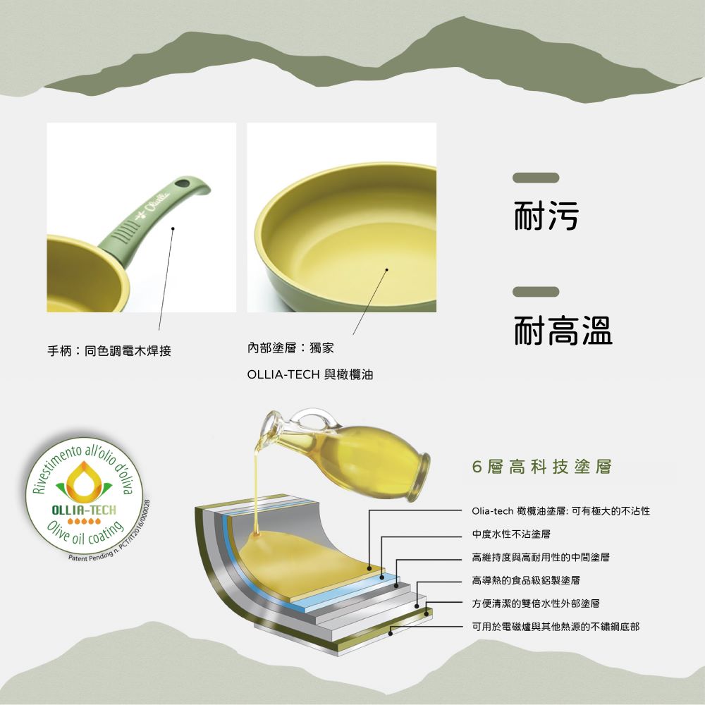 尺寸:28公分 高度:4.5mm 內部塗層:獨家 Ollia-tech 與橄欖油 外部塗層:耐污、耐高溫 手柄:同色調電木焊接並印有“Olivilla”LOGO 底部:拉絲並印有“Olivilla”LOGO,適用於所有熱源,包括電磁爐