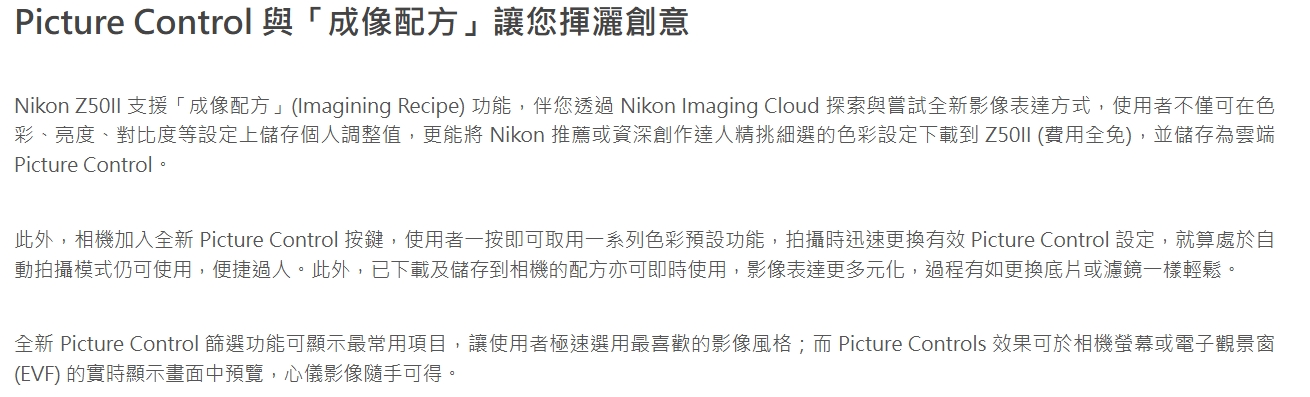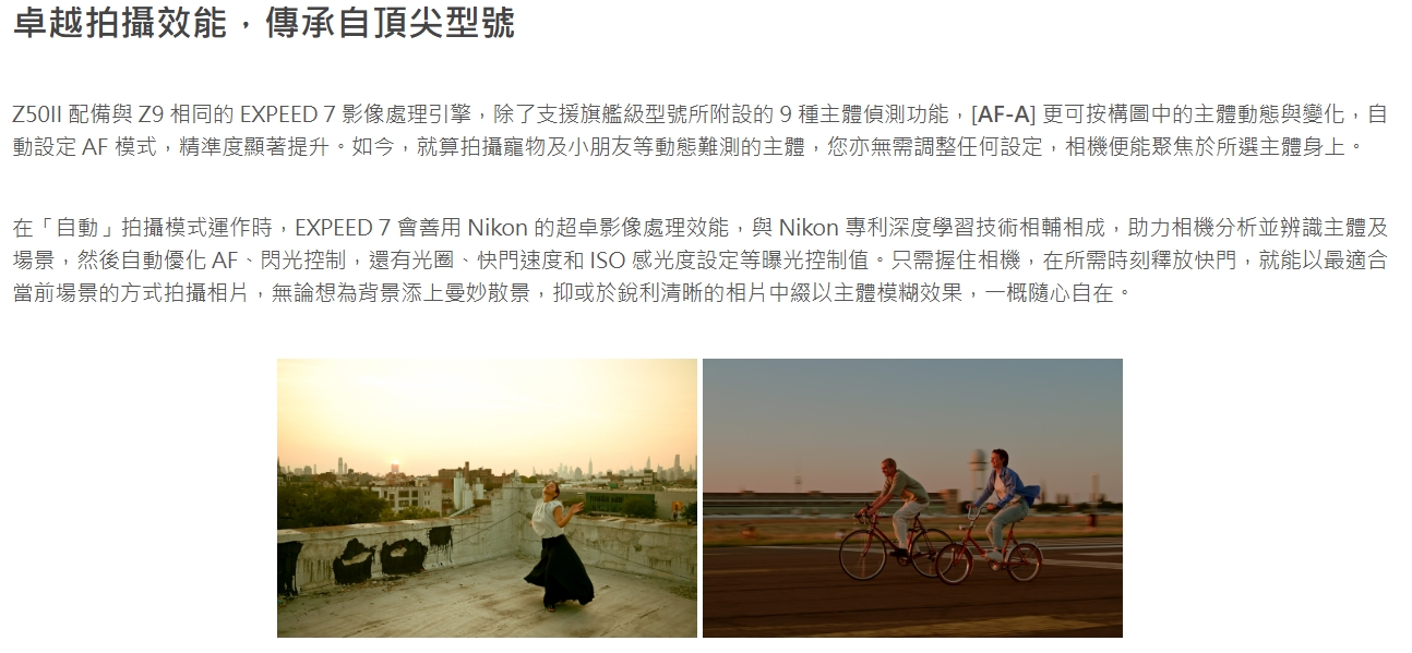用 Z50II 釋放您的想像力,一款輕盈小巧的 APS-C 無反光鏡相機 (DX 格式),擁有強大而直觀的功能,專為新興內容創作者而設。使用 5.6K 過取樣感應器創作電影般的故事,即使在低光環境下也能拍攝細節豐富的 4K 影片 。Z50II 提供產品評測模式、高解析度變焦、隨插即用的網絡攝影機支援和音訊錄製選項,非常適合拍 Vlog 和直播。透過各種色彩設定、 創作者製作的成像配方,以及 31 種 Creative Picture Controls,展現您的個人風格。享用卓越的主體偵測、AF 效能和強大的影像處理功能,打造自信時尚的創作。