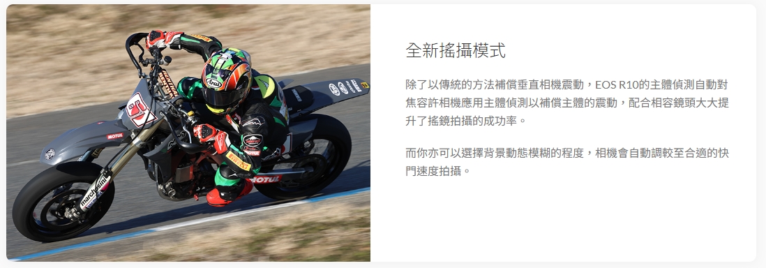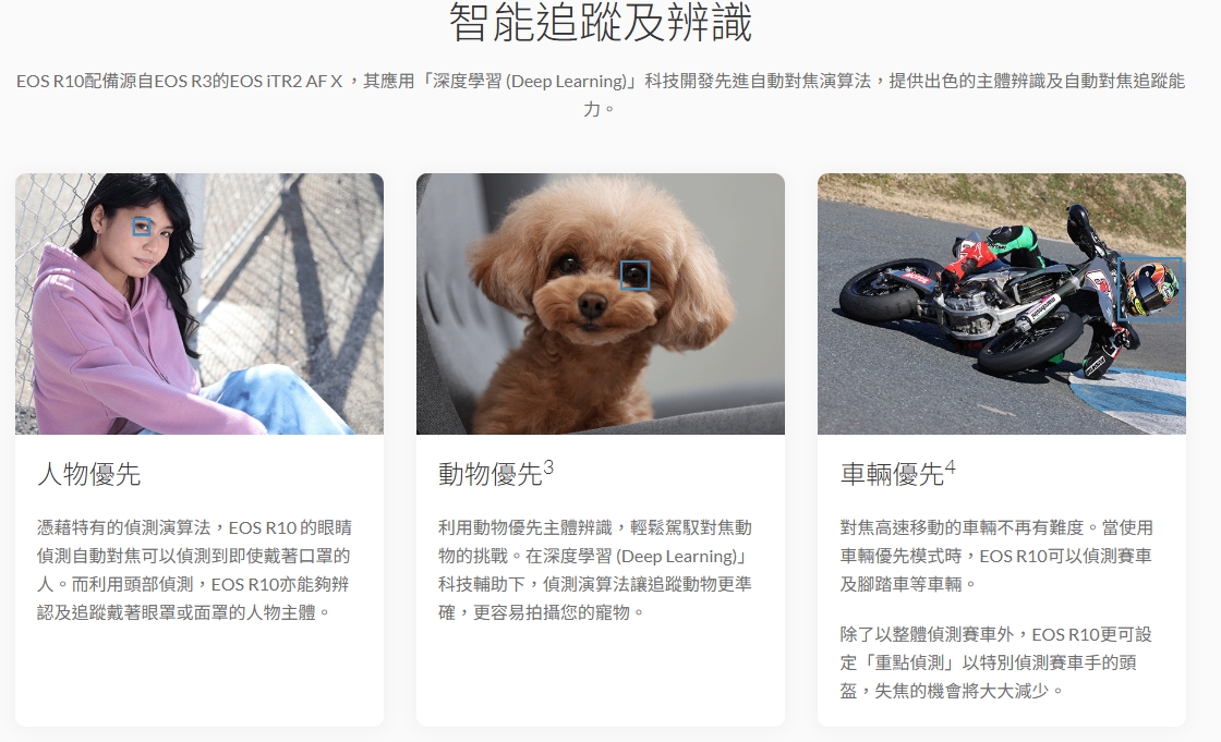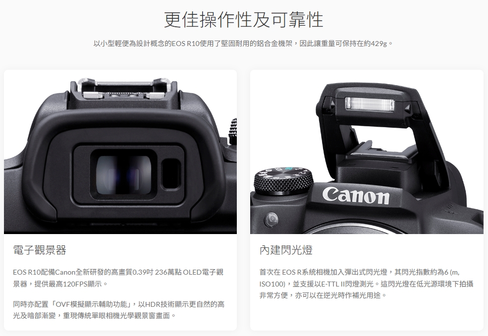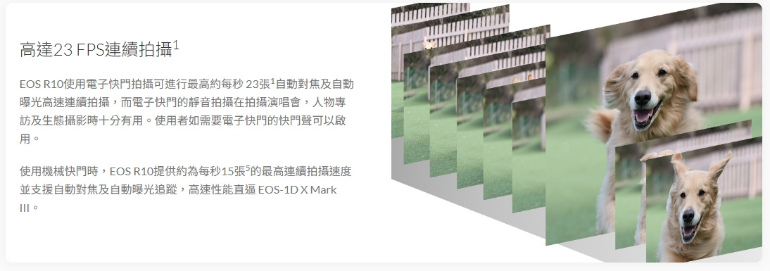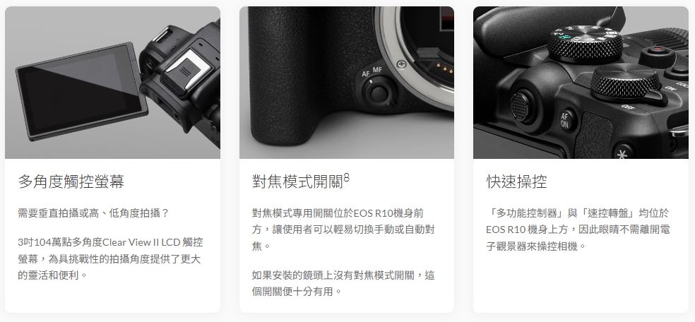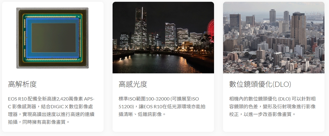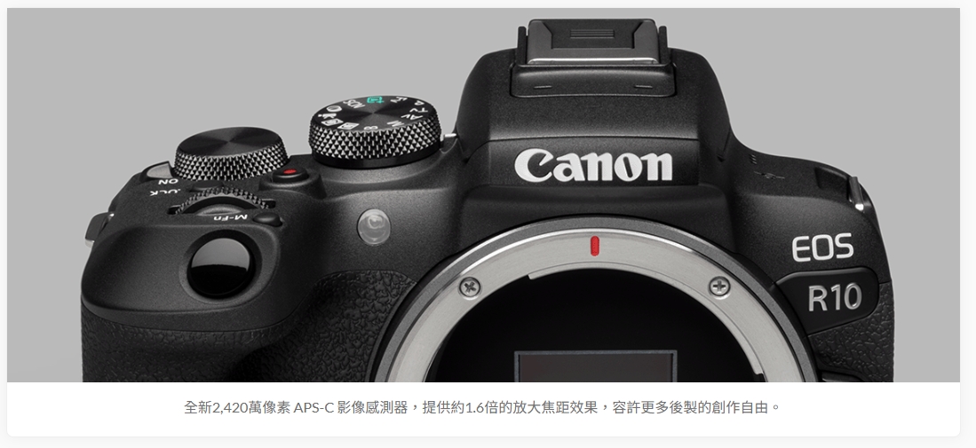 重量只有約429g 的EOS R10專為攝影愛好者而設計,配備Canon高速2,420萬像素APS-C CMOS影像感測器、電子快門最高約每秒 23張連續拍攝、支援HDR PQ高動態範圍拍攝及內建「數位鏡頭優化(DLO)」功能提昇影像畫質。EOS R10更加入源自EOS R3的EOS iTR AF X ,其應用「深度學習 (Deep Learning)」科技開發先進自動對焦演算法,提供出色的人物、動物及車輛主體辨識及自動對焦追蹤能力。短片拍攝方面,EOS R10支援高畫質無裁切 4K UHD 30P (6K超取樣) 短片、裁切的4K UHD 60P短片及無裁切FHD 120P短片,令短片創作更具彈性。EOS R10亦新增全景拍攝及深度合成等功能,讓使用者可以輕易探索更多攝影可能性。